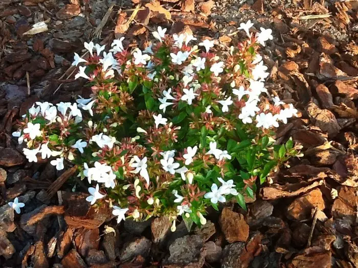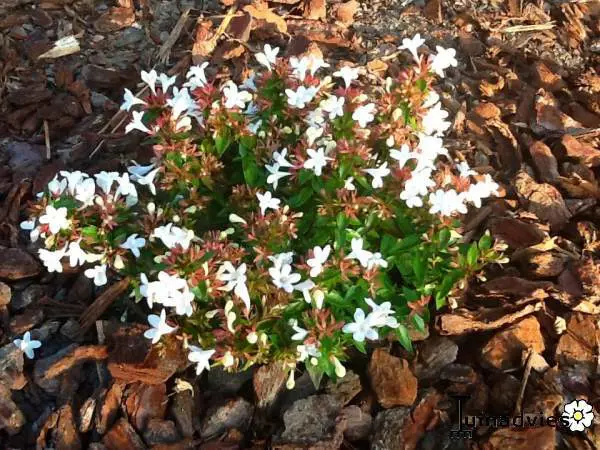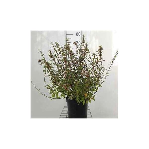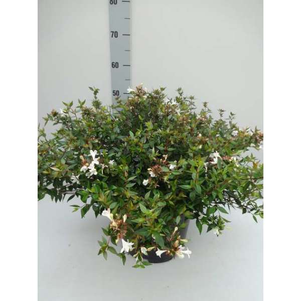 Abelia x grandiflora 'Prostrata' is een compacte, breed uitgroeiende struik met groene bladeren die in het najaar een mooie purperroze verkleuring krijgen aan de bladrand.