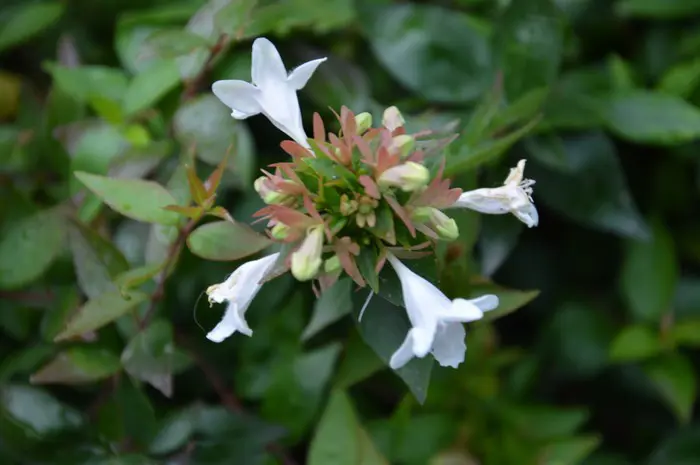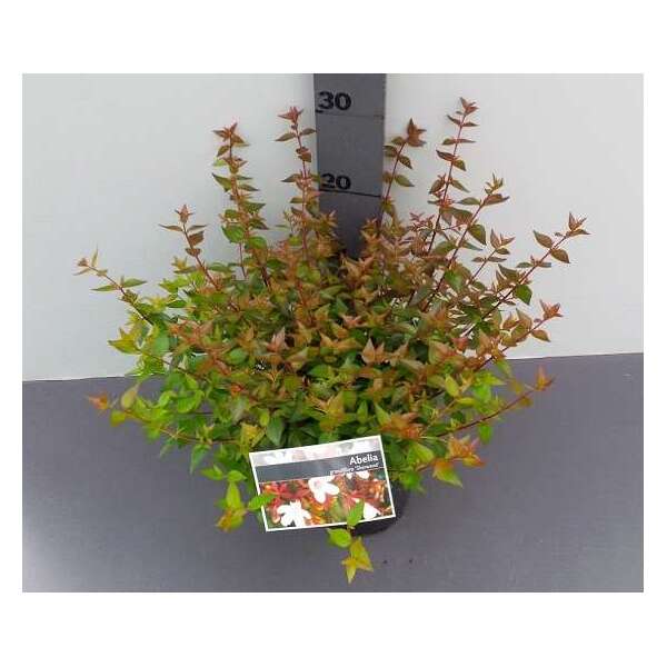 Abelia x grandiflora 'Sherwood' is een compacte, ronde tot spreidende struik met gebogen takken en eivormige, glanzende brons naar donkergroen verkleurende bladeren die dan paars en brons verkleuren in de winter.
