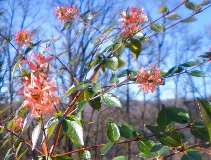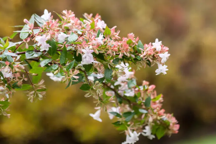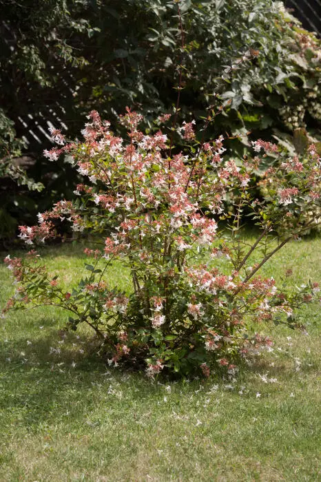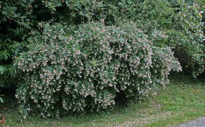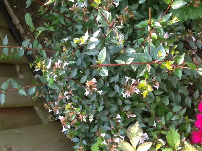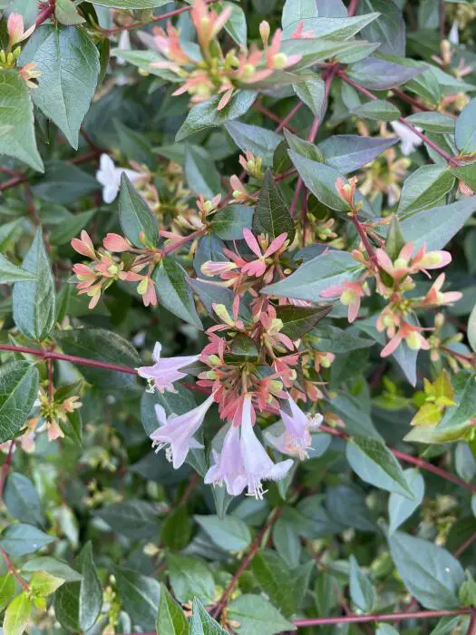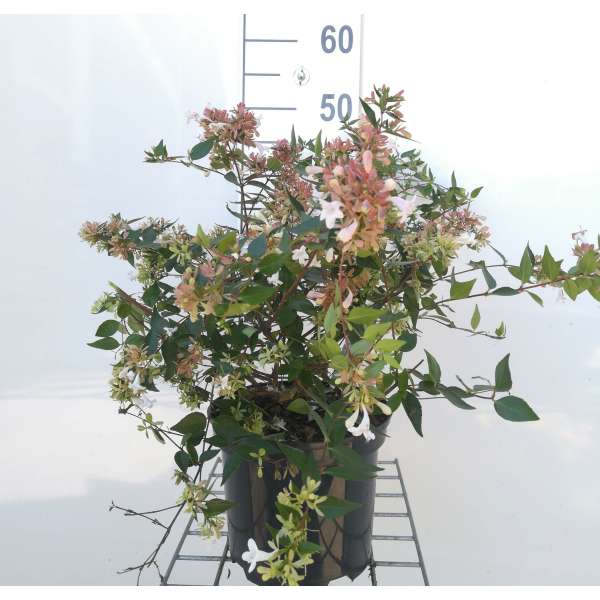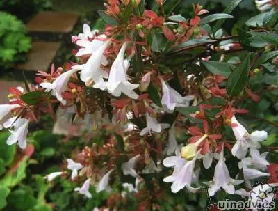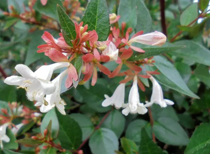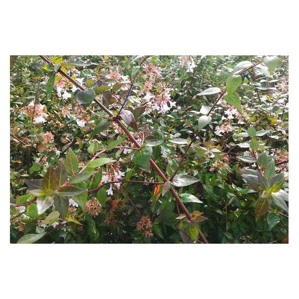 Abelia x grandiflora is een kruising tussen de Abelia chinensis en de Abelia uniflora.