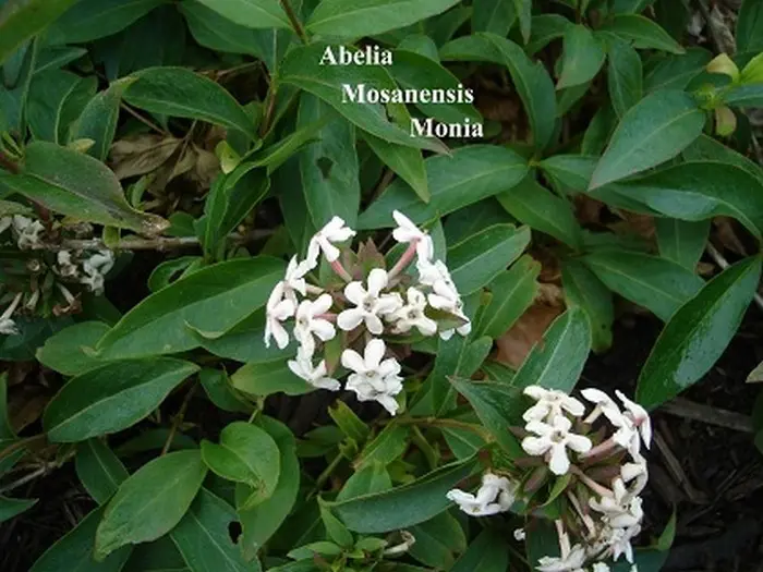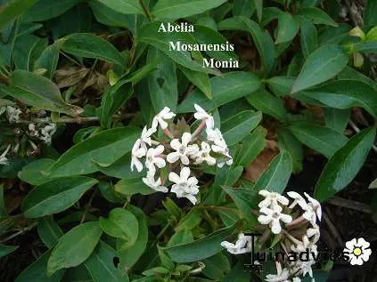 Abelia mosanensis 'Monia' is een ronde heester met rechtopstaande tot gebogen stengels en breed lancetvormige, glanzende donkergroene bladeren dat in de herfst oranjerood kleuren.