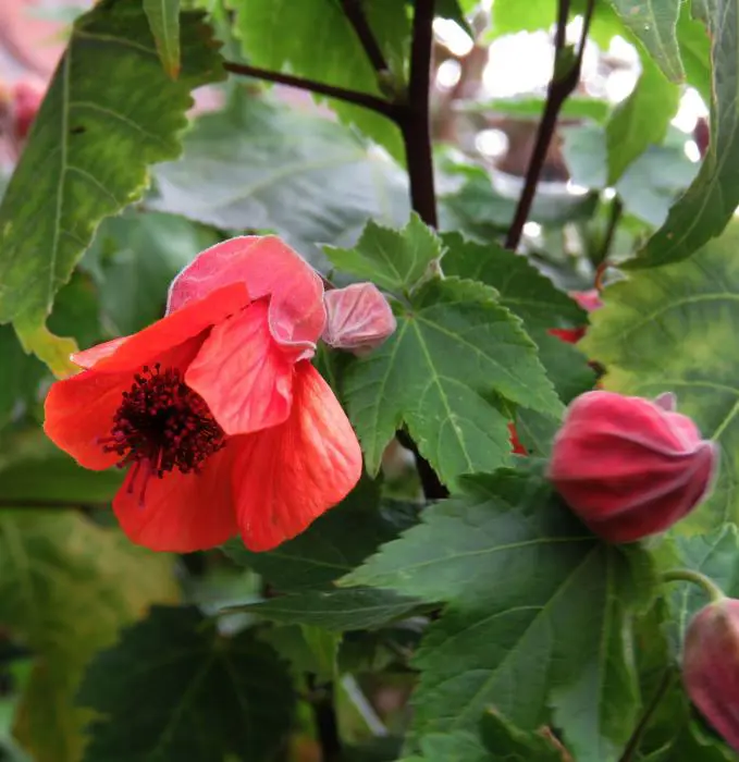 Abutilon x 'Louis Sasson' bloeit met diep roodoranje bloemen met een zwarte kelk aan donkere stelen.