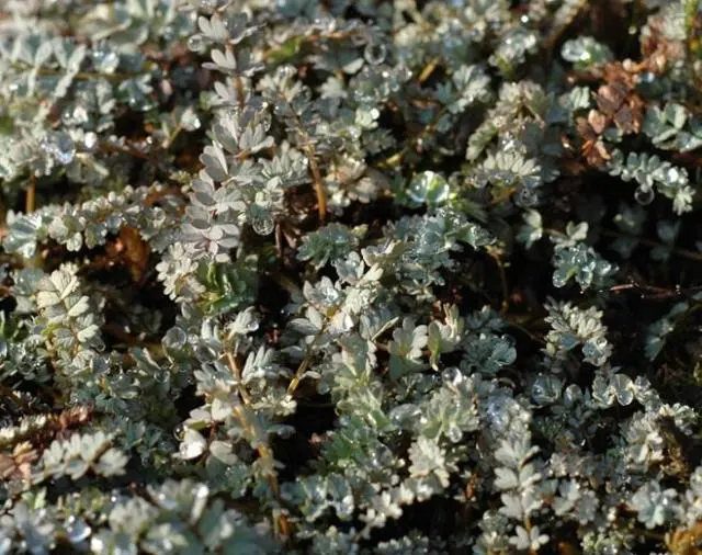 De veervormige blauwgrijze bladeren groeien breed over de bodem uit en vormen een mooi tapijt.