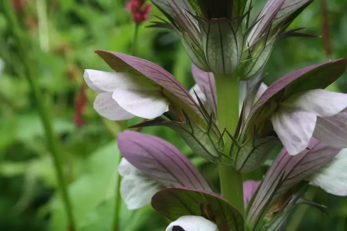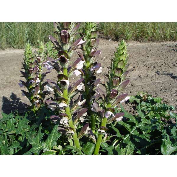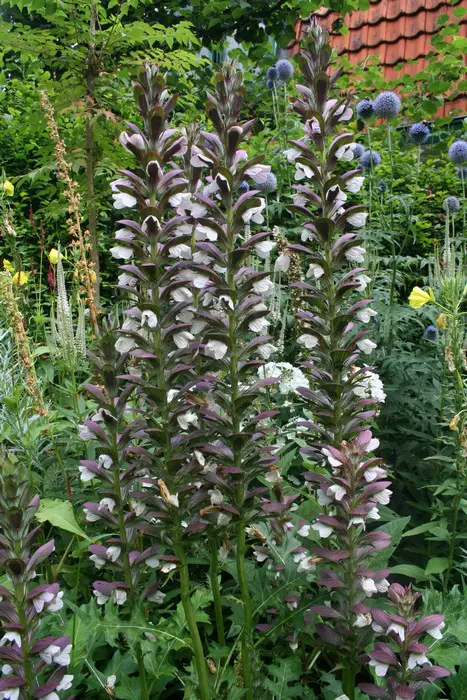 Acanthus 'Hollande du Nord' is een statige vaste plant met een grote sierwaarde die structuur geeft in de tuin met zijn grote bladeren en aarvormige bloemen.