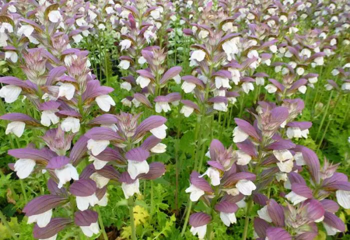 In de zomer bloeien de hoge aren met witte bloemen en stekelige, dof paarsroze schutbladeren, na de bloei blijven ze nog tot in het najaar decoratief.
