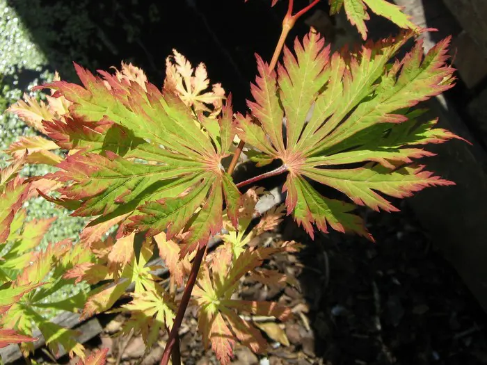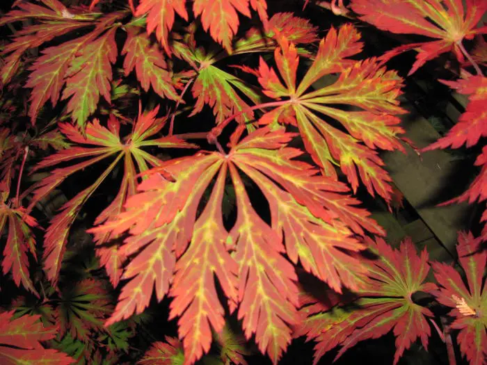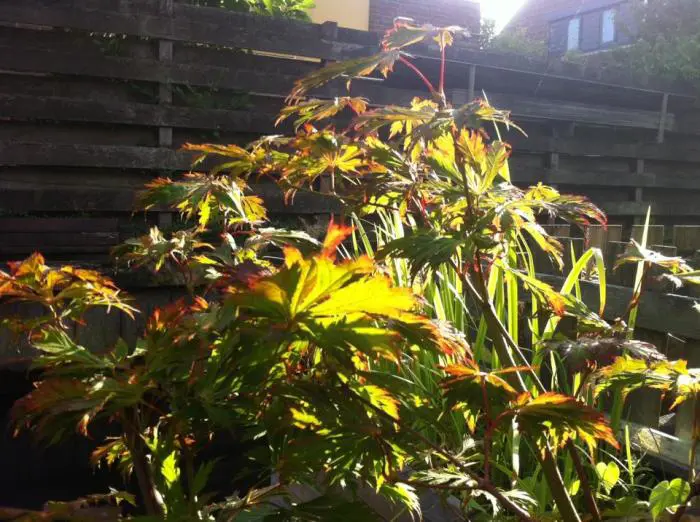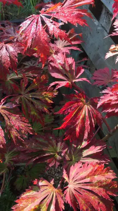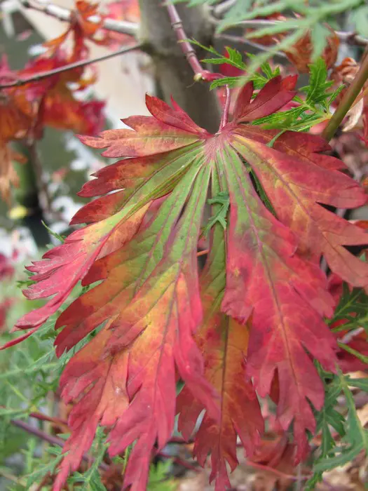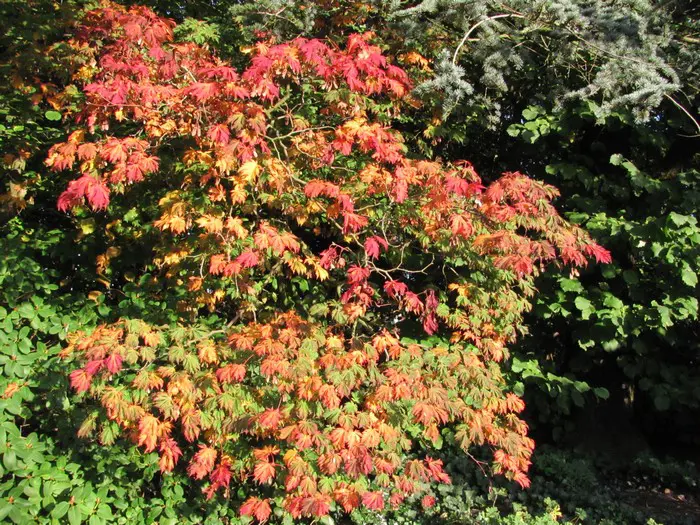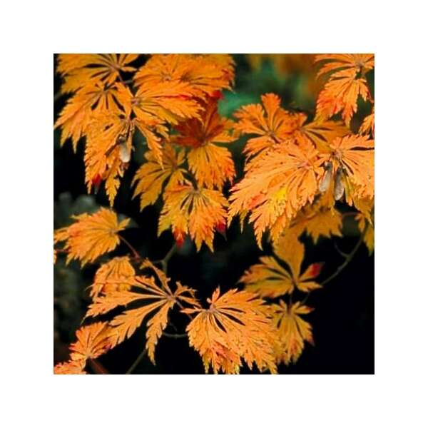 Acer japonicum 'Aconitifolium' is een kleine, traaggroeiende japanse esdoorn tot 4m met diep ingesneden varenachtige groene bladeren. In de herfst prachtig opvallend oranjerood tot wijnrood verkleurend.