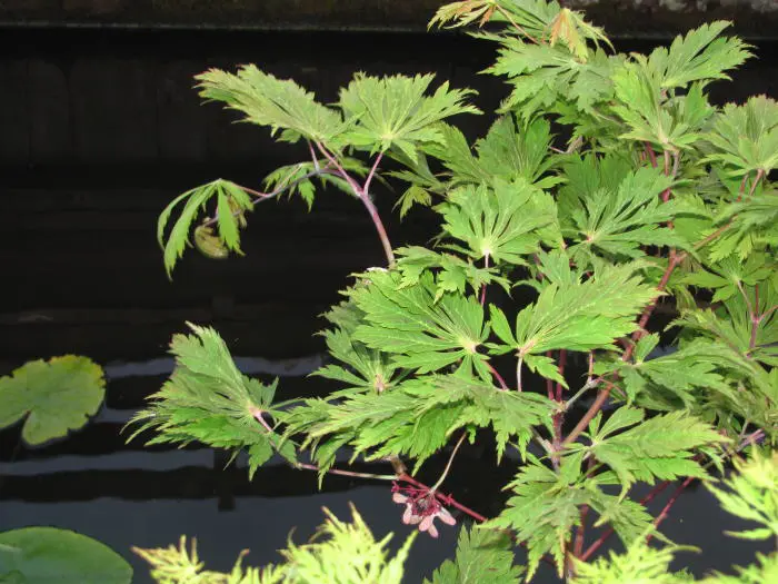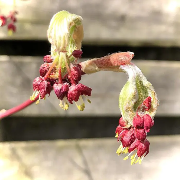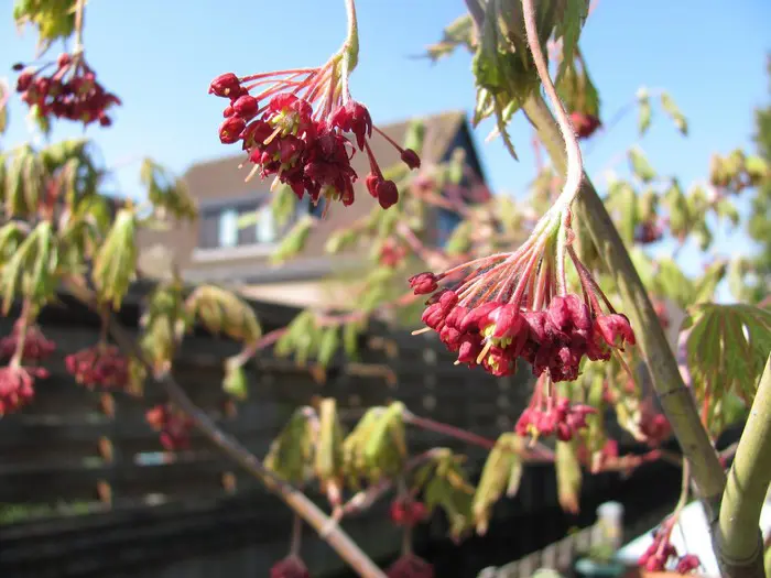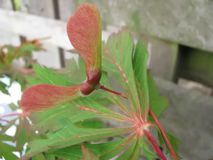 Van midden zomer tot oktober hangen de typische esdoornzaadjes, de gevleugelde nootjes aan de plant.