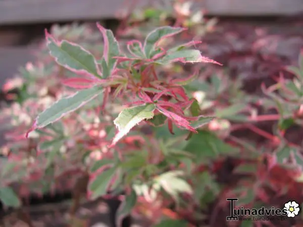 Het blad is bijzonder helder in het voorjaar, lichtgroen omzoomd met roze en soms crème. Deze schitterende schakering wordt in de zomer wat zachter, waarna de kleine boom in de herfst hevig rozerood kleurt.