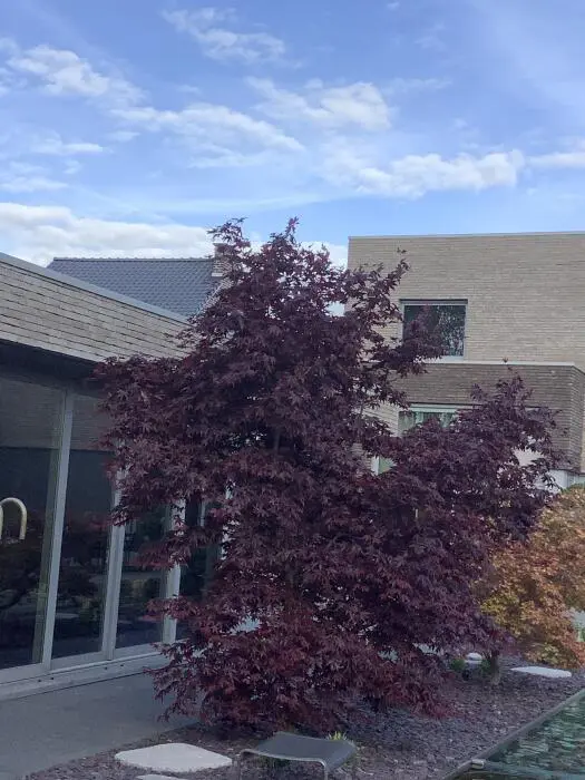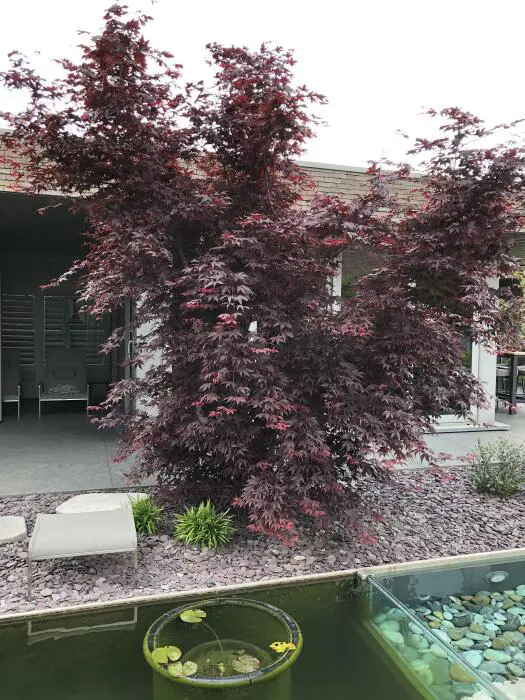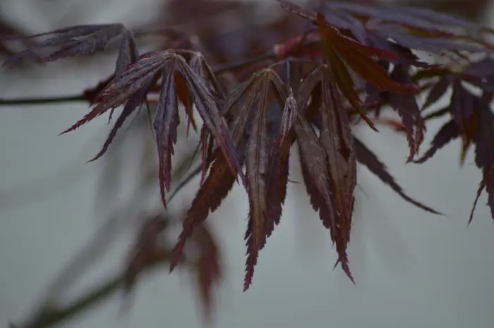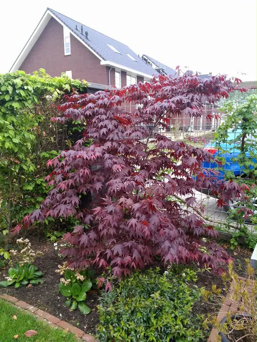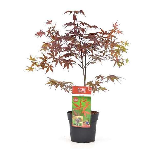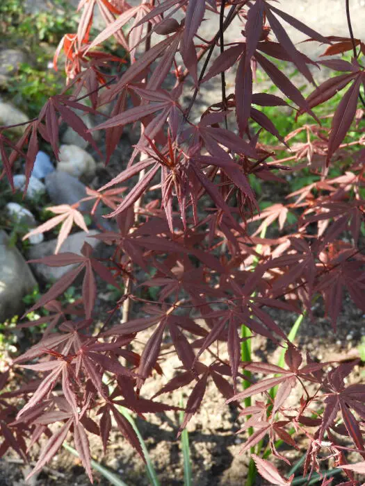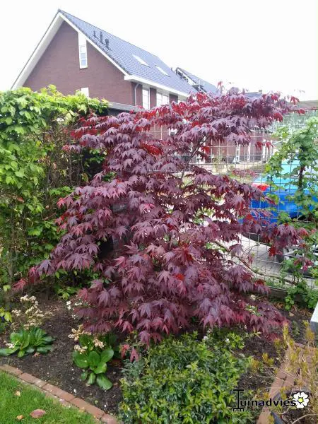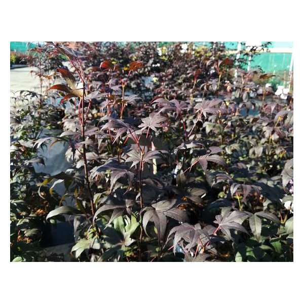 Acer palmatum 'Bloodgood' is een langzaam groeiende heester/boom, smal opgaand met diep purperrood ingesneden blad dat mooi verkleurt in de herfst naar wijnrode tinten.