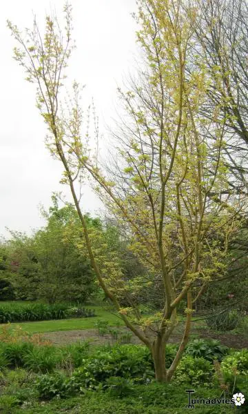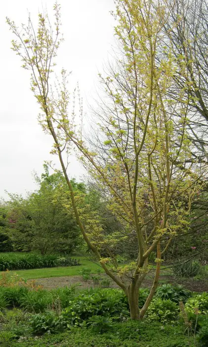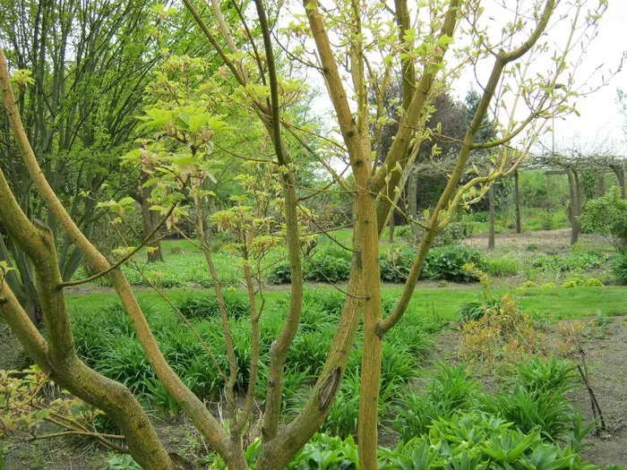 Acer rufinerve 'Erythrocladum' is een variëteit met geel gestreepte, witte stam dat vooral in de winter goed opvalt.