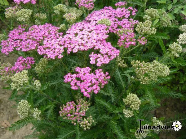 Achillea millefolium 'Pretty Belinda' is een compactgroeiende, goed vertakte cultivar met platte tuilen van felrode naar helder koraal verkleurende bloempjes.