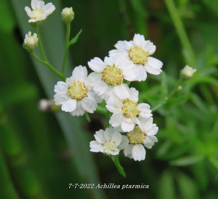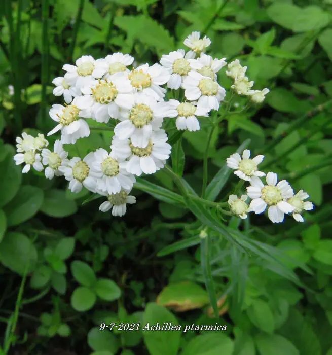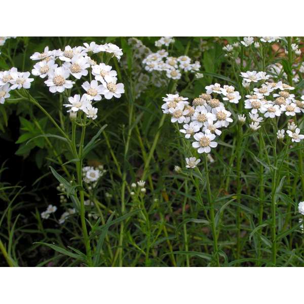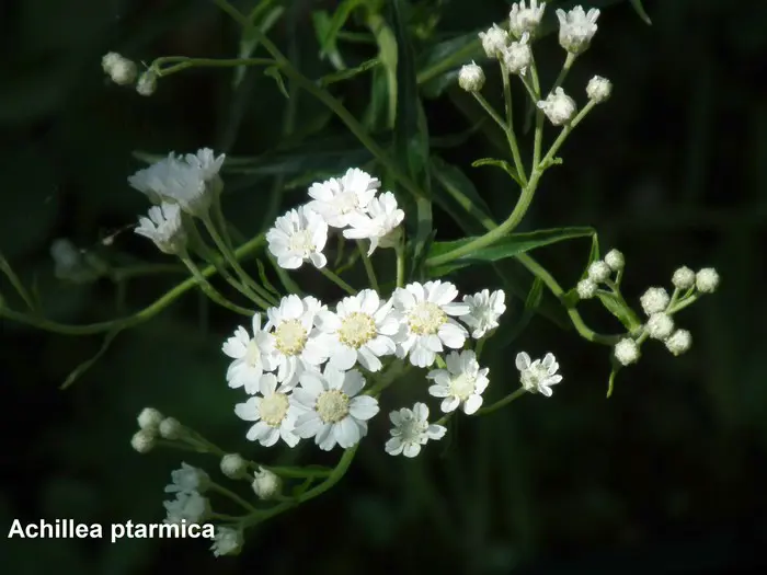 Achillea ptarmica is een bossige en rechtopstaande plant met lintvormige, licht behaarde groene bladeren.