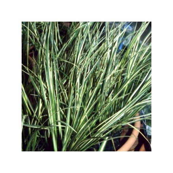 Acorus calamus 'Argenteostriatus' heeft zwaardvormige bladeren overlangs roomwit gestreept.