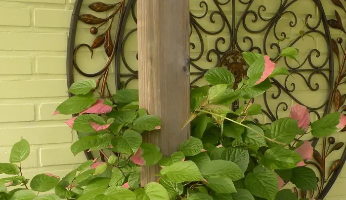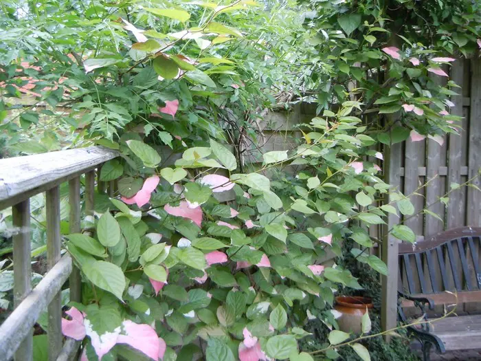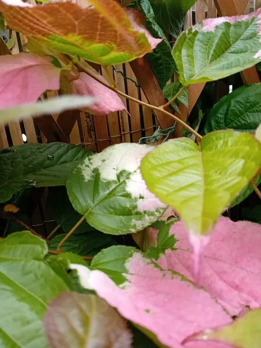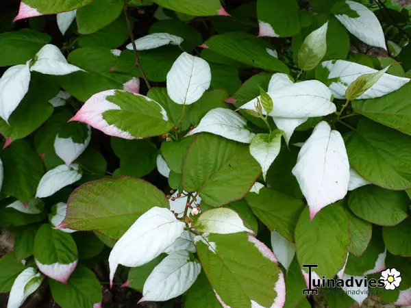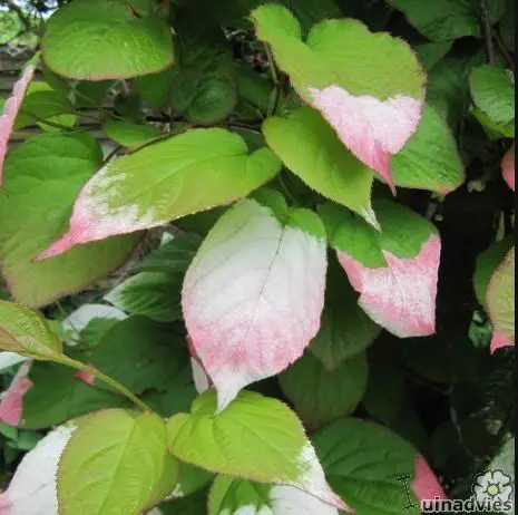 Actinidia kolomikta is een prachtige klimstruik met hartvormig groen blad dat roze en wit vlekken heeft die pas na het 2de of 3de jaar verschijnen op de bladuiteindes.
