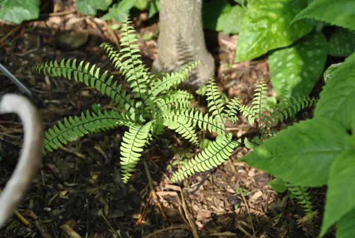 Adiantum aleuticum 'Imbricatum' is een dwergvaren met zwart gesteelde, waaiervormige, bleek blauwgroene blaadjes.