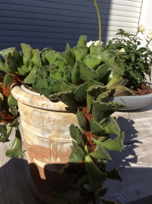 Vormt een korte tak bedekt met roodbruine fijne luchtwortels. De bladeren zijn vlezig en behaard, driehoekig met golvende randen.