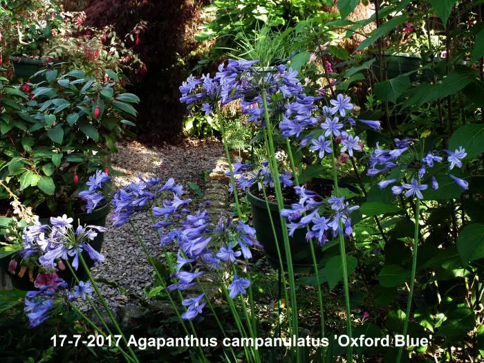 Agapanthus campanulatus 'Oxford Blue' (Salver-groep) uit Zuid-Afrika is een bladverliezende soort met lange grasachtige bladeren;