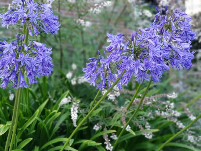 Agapanthus 'Loch Hope' heeft riemvormige bladeren en bloeit rijkelijk met afgeplatte ronde schermen van trompetvormige bloemen op stevige paarsgroene stengels. De bloemen zijn lichtjes afhangend, violetblauw met een donkere nerf.
