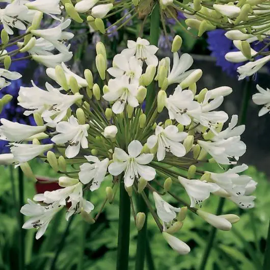 Agapanthus 'White Umbrella' heeft riemvormige bladeren en bloeit rijkelijk met grote ronde schermen van witte trompetvormige bloemen op stevige groene stengels.