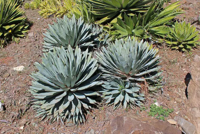 Agave macroacantha groeit in Mexico, vormt een dichte rozet van lange vlezige bladeren met stekelige randen en eindigt in een zeer scherp zwart punt.