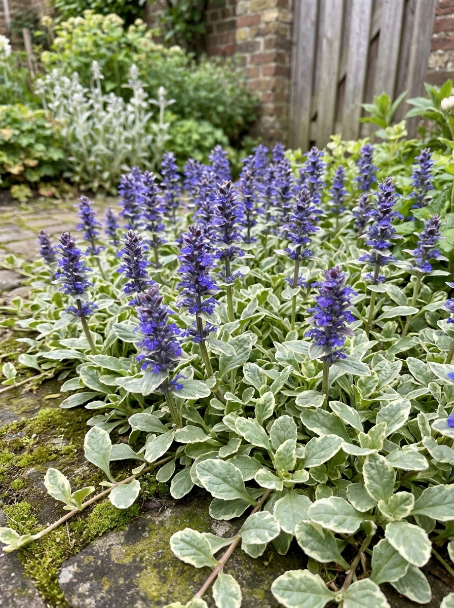 Ajuga reptans 'Variegata' is een kruipende vaste plant met korte aren samengesteld uit kleine violetblauwe bloemen