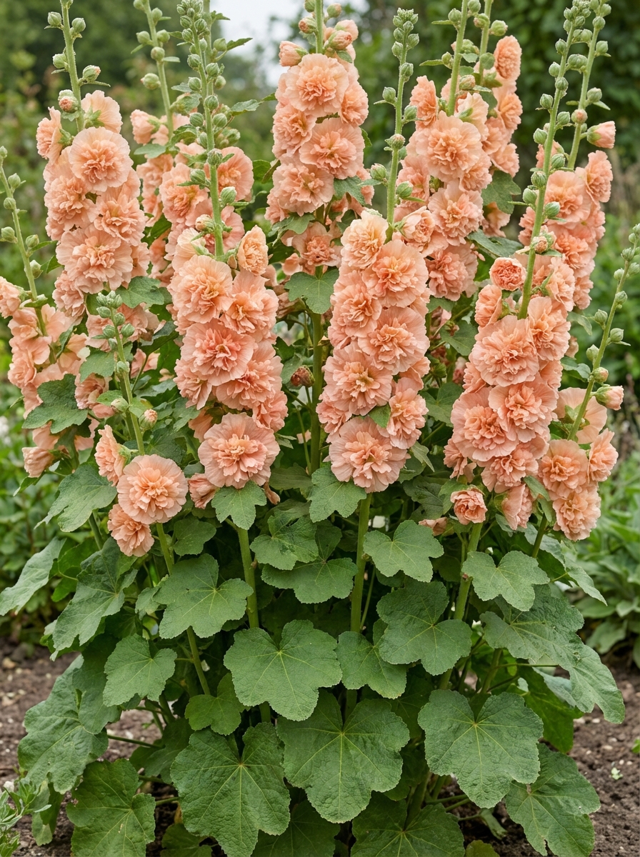 Alcea rosea 'Chater's Double Apricot' bloeit met abikooskleurige, dubbele goedgevulde bloemen.