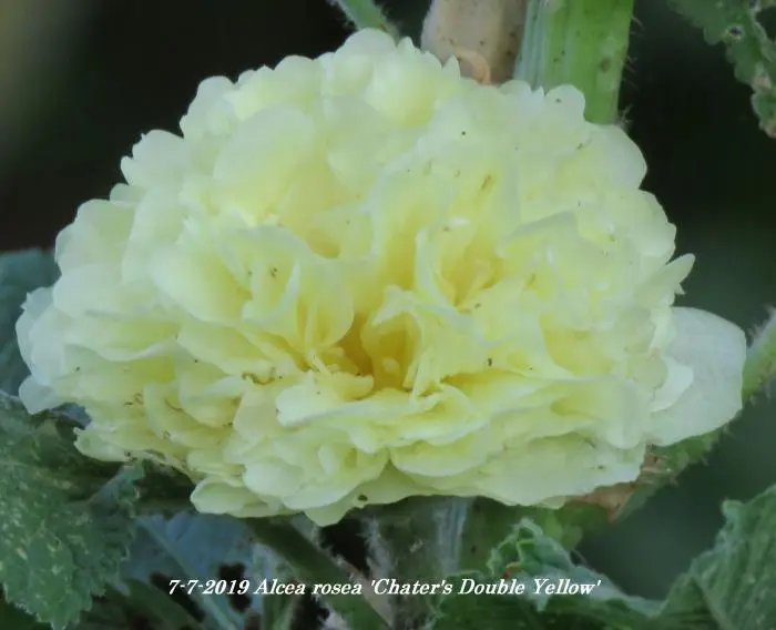 Alcea rosea 'Chater's Gelb' bloeit met gele, dubbele goedgevulde bloemen.