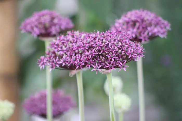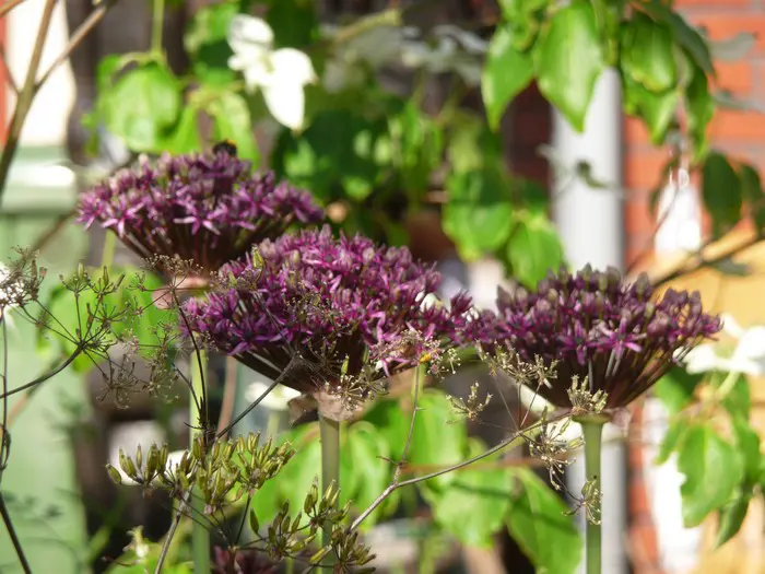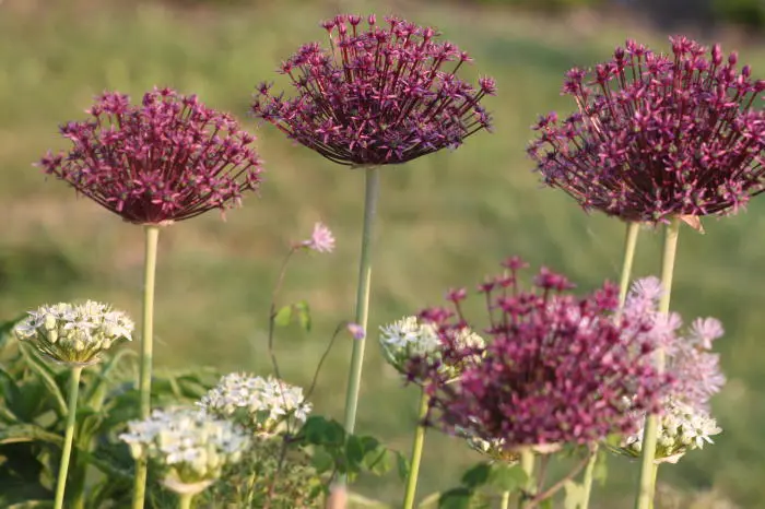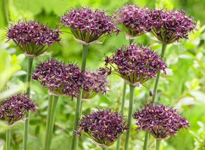 Allium atropurpureum bloeit met grote, zeer donkere, wijnrode bolvormige bloemen op hoge stevige stengels. Na de bloei volgen de mooie zaaddozen die nog lang aantrekkelijk blijven.