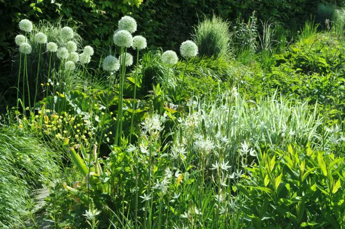 Allium 'Mont Blanc' is een bolgewas met glanzende, bandvormige, grijsgroene basisbladeren.