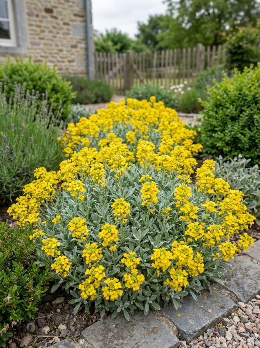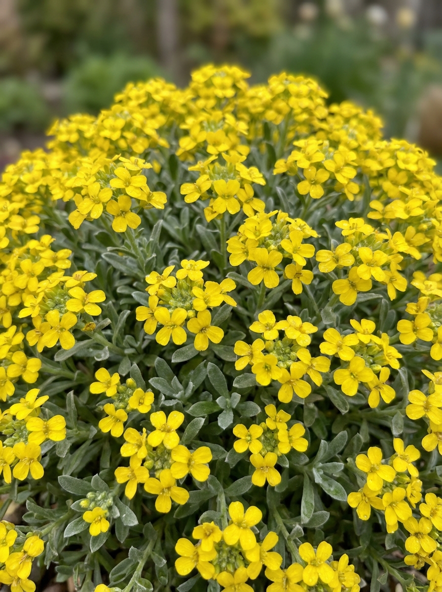 Alyssum montanum 'Berggold' vormt een brede grijsgroen tapijt met trosjes van goudgele bloempjes.