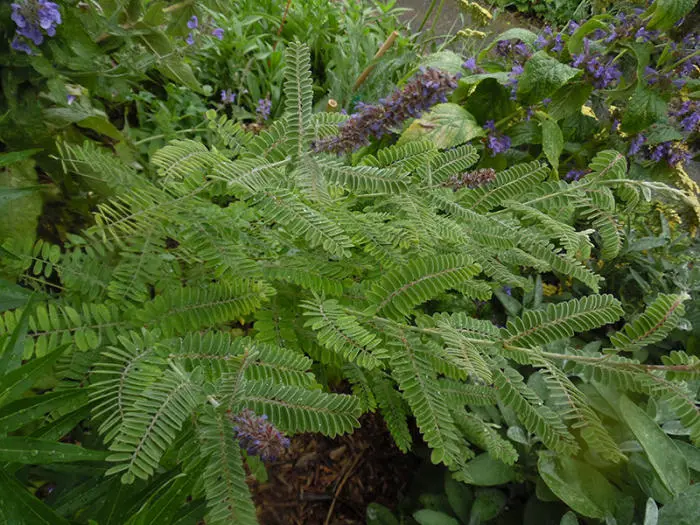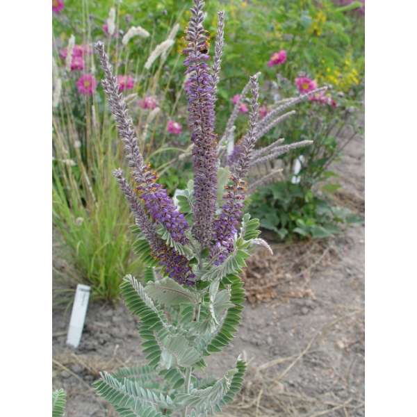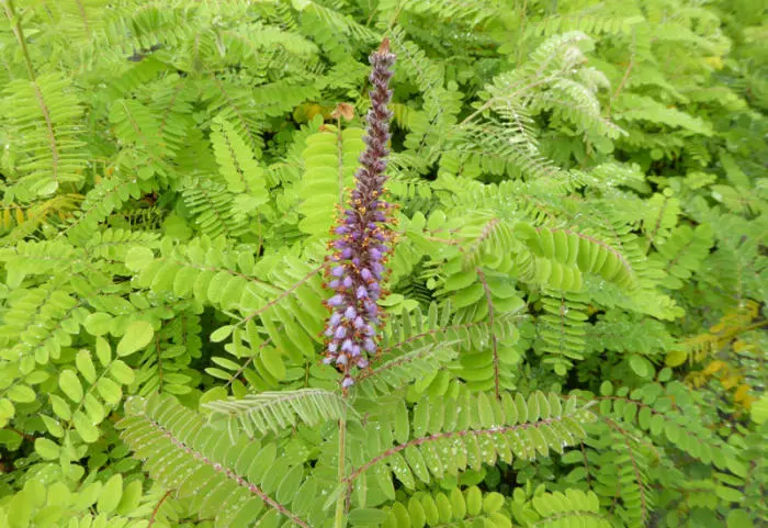 Een halfheester met violetblauwe aren met gele meeldraden en een grijsbehaard vederblad.