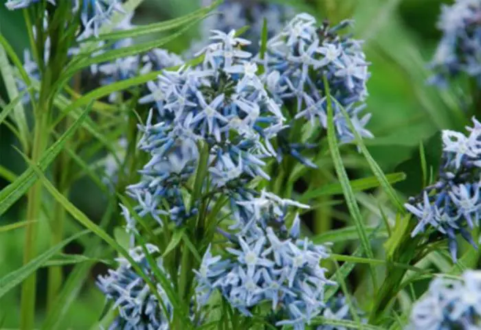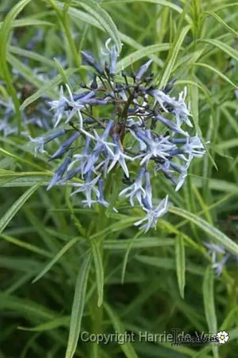 Amsonia 'Ernst Pagels' is een opgaande vaste plant met wilgachtig, overhangend elliptisch blad en losse trossen van lilablauwe sterachtige bloemen.