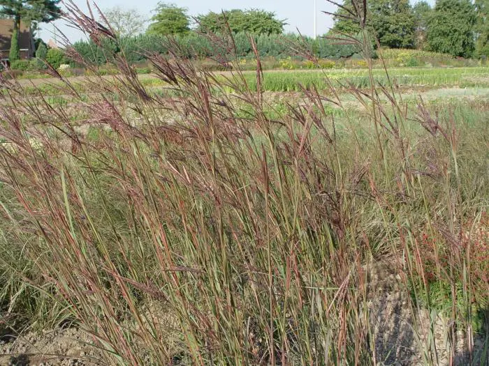 Andropogon gerardii 'Weinheim Burgundy' is een hoog gras met gebogen, lineaire, blauwgroene bladeren die in de herfst dieporanje/koperrood verkleuren.