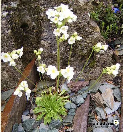 Androsace armeniaca var. macrantha vormt een rozet van langwerpige groene bladeren en schermen van witte of roze bloemen op lange stelen (5--30cm).