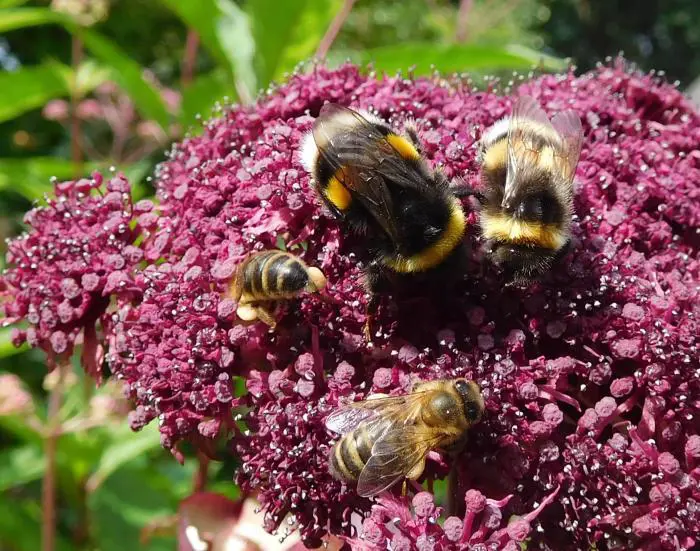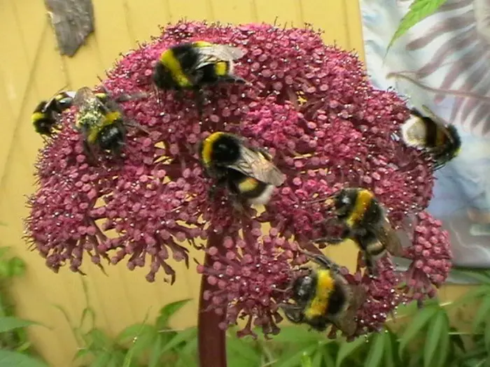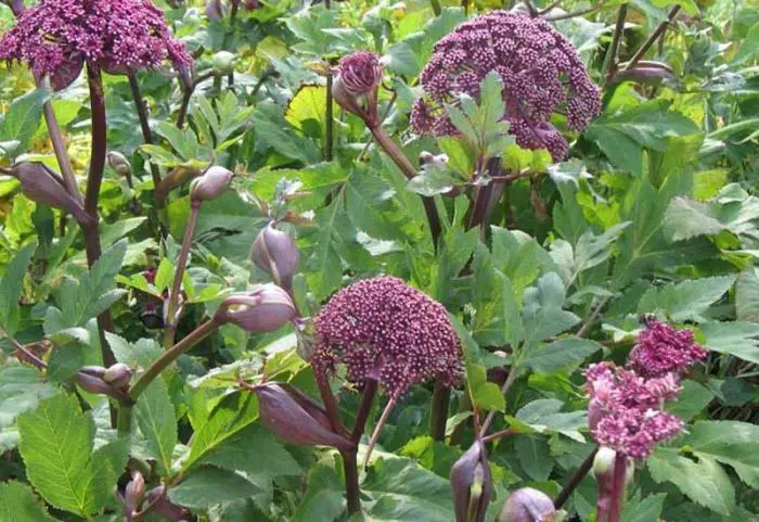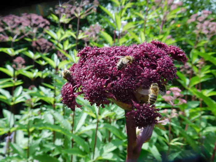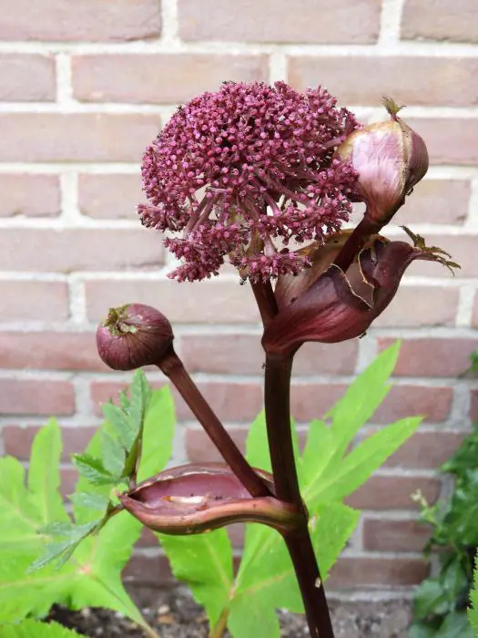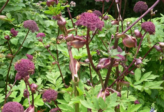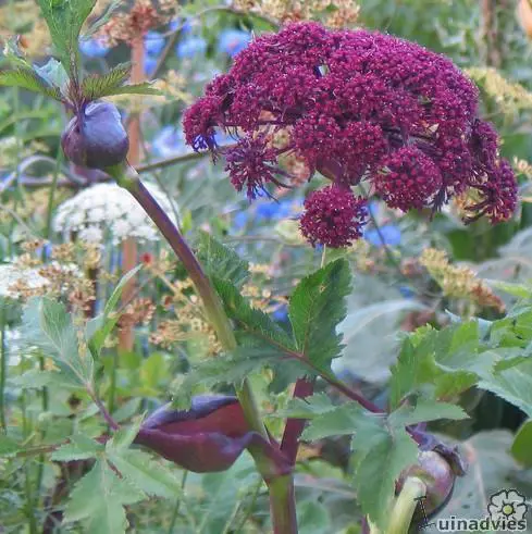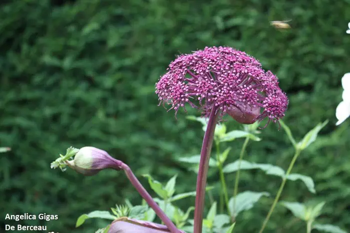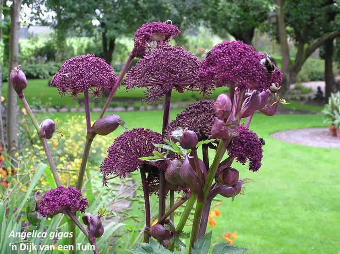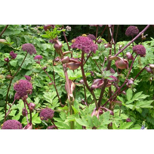 Angelica gigas bloeit aan lange stevige, donkerrode bloemstelen met ronde donkerpaarse tot paarsrode bloemschermen van ø12cm.