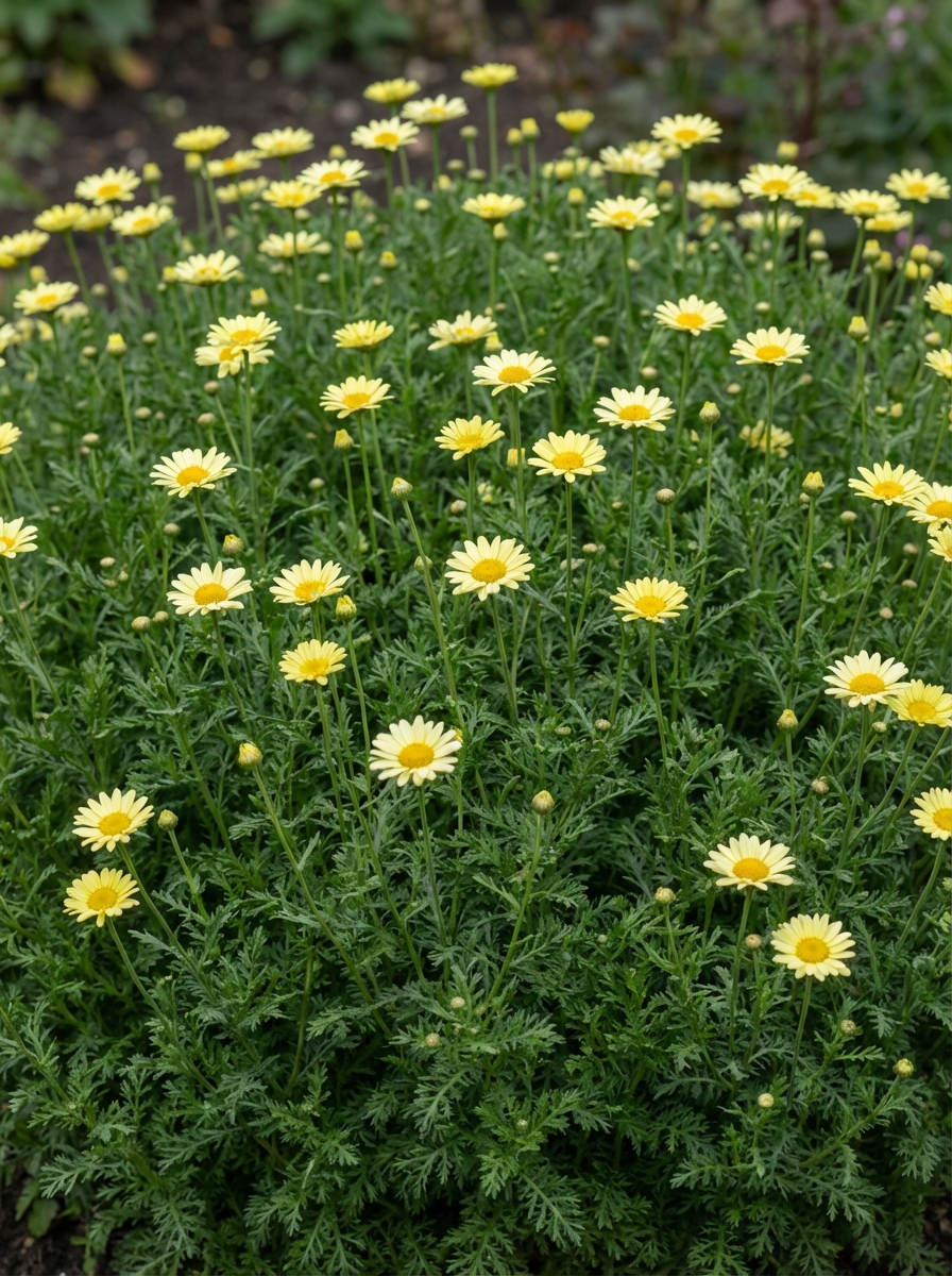 Anthemis x hybr. 'E.C. Buxton' bloeit rijkelijk met zachtgele bloemen met in het centrum een feller geel hart.
