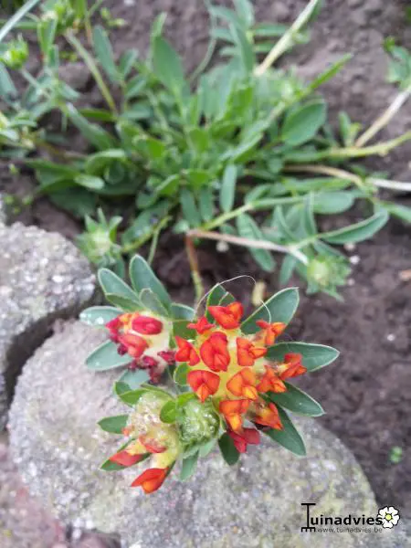 Anthyllis vulneraria 'Coccinea' vormt donker grijsgroene rozetten waaruit lange slappe stengels groeien. De bloemen bestaan uit kleine roodoranje bolletjes.