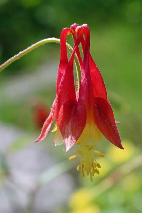 Het is een rechtopgaande plant met vertakte stengels met knikkende bloemen, scharlakenrode kelkbladen met lichtgele bloembladen en lange meeldraden.