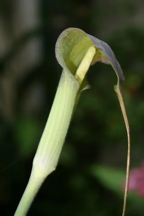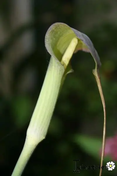 Arisaema consanguineum is een Arisaema bloeit met een bleekgroen/purperbruin gestreepte bloemschede met een lange draadvormige spadixsliert en een groene kolf. In de late zomer komen er roodoranje bessen aan.