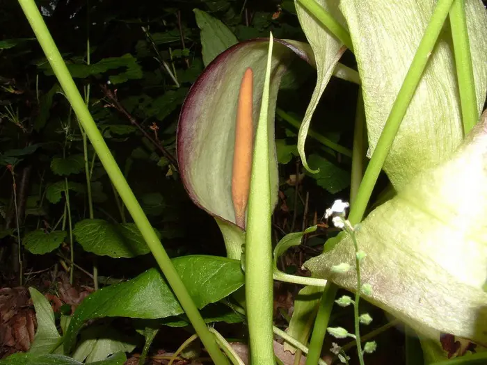 In april en mei bloeit een groenwitte bloemschede rondom een bleekgele kolf waarop na de bloei rode of oranje bessen op komen, die trouwens zeer giftig zijn.