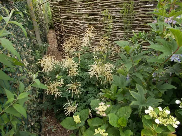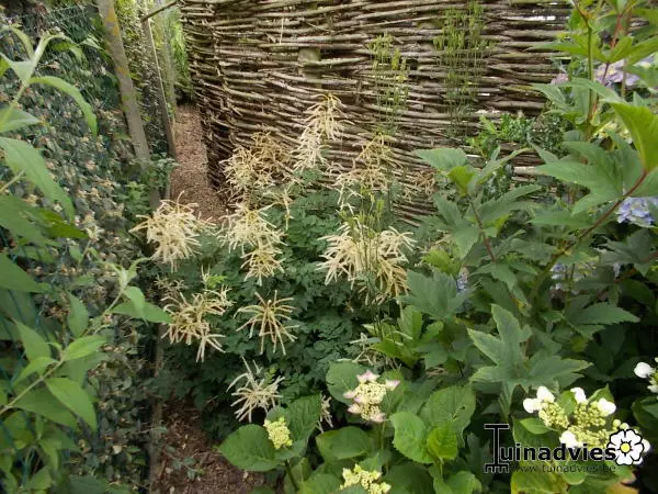 Aruncus Johannisfest' is een hybride met een compacte ronde groeiwijze en varenachtige donkergroene bladeren met een mooie herfstkleur.