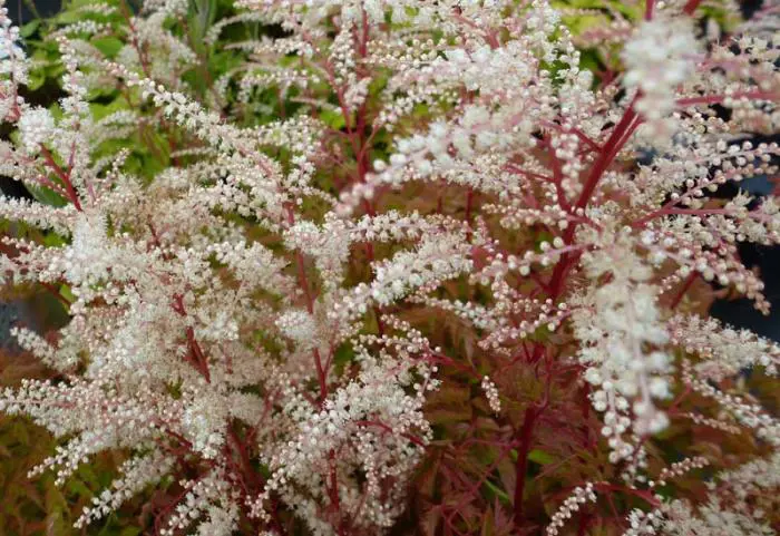 Bloeit rijkelijk met roomwitte pluimen aan rode stelen.