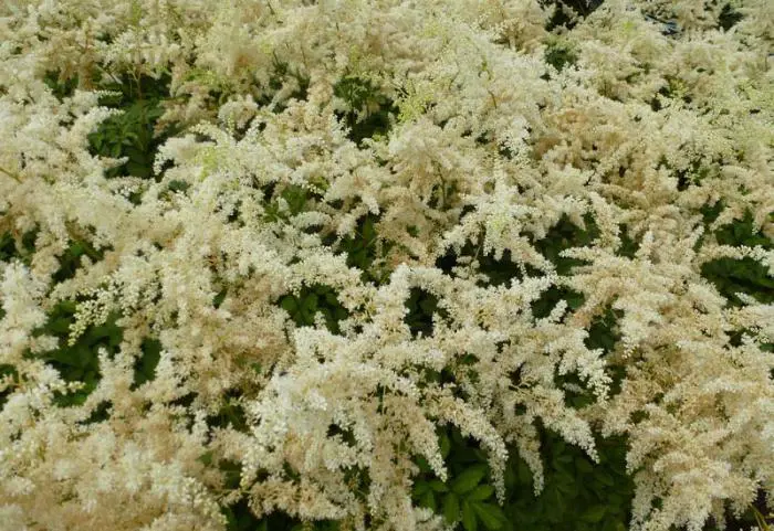 Vanaf juni bloeien de witte tot ivoorwitte bloemen verzameld in korte, goed vertakte en dichte pluimen.