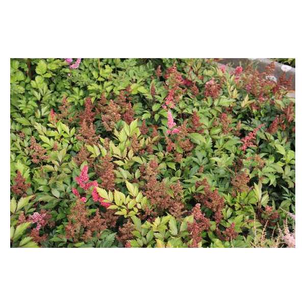 Astilbe japonica 'Vesuvius' is een waardevolle plant met mooi gevederd donkerrood blad en een pluimachtige helderrode bloeiwijze.