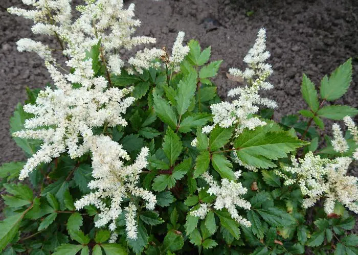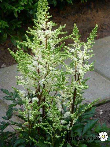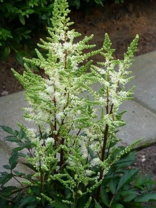 Astilbe 'YOUNIQUE White'bloeit met geurende grote pluimvormige witte bloemen.