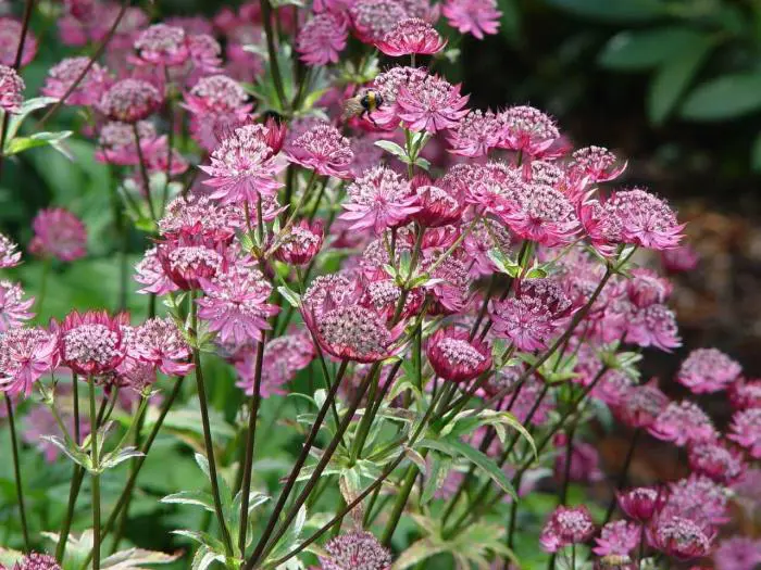 Astrantia major 'Claret' bloeit met prachtige, fijn gestructureerde, levendig roze bloemen en brillantrode schutbladen.