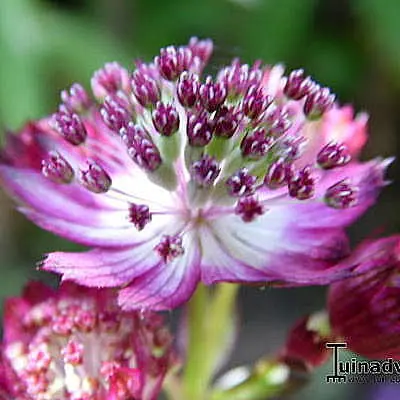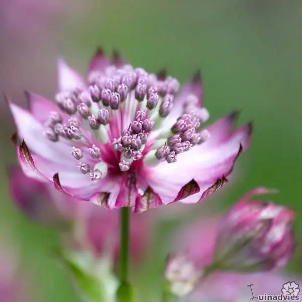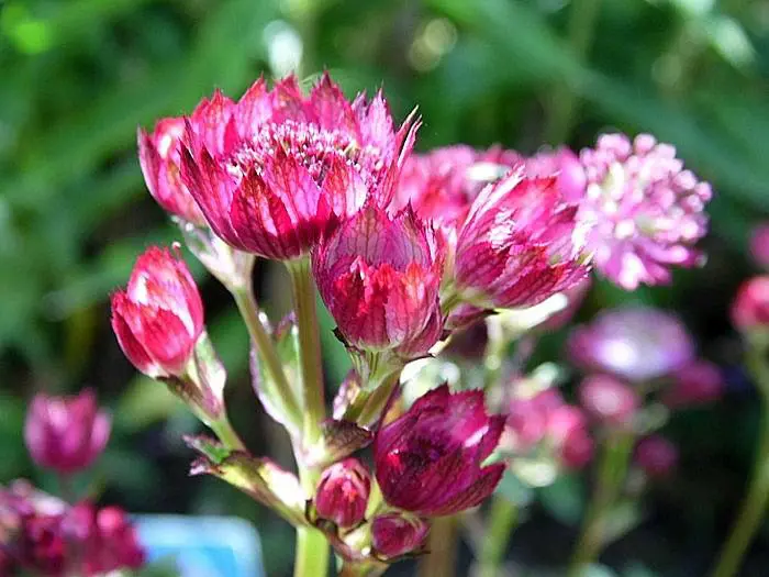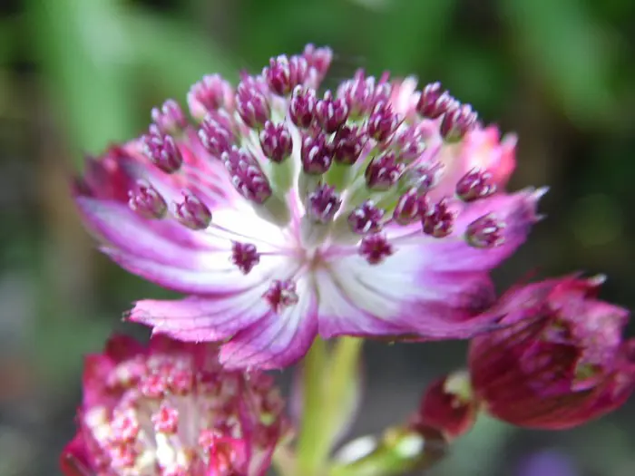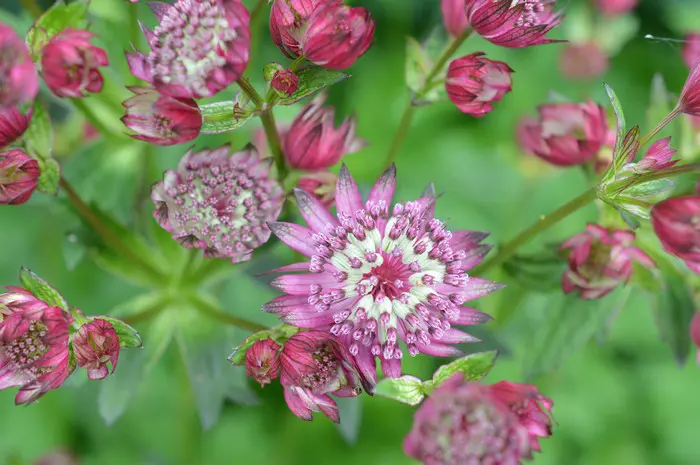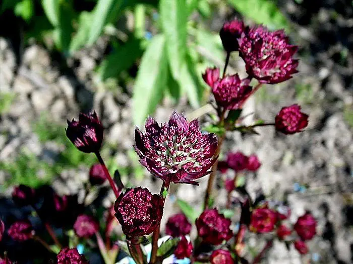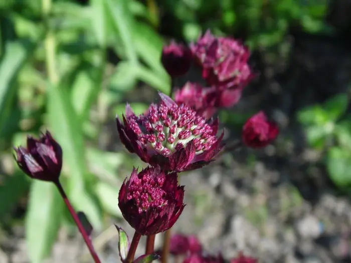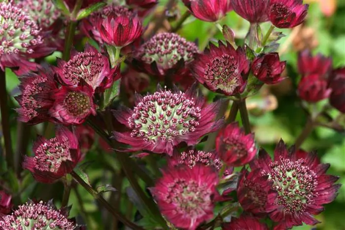 Astrantia major 'Moulin Rouge' bloeit met prachtige, fijn gestructureerde donkerrode bloemen en met paars omrande, rode schutbladen.