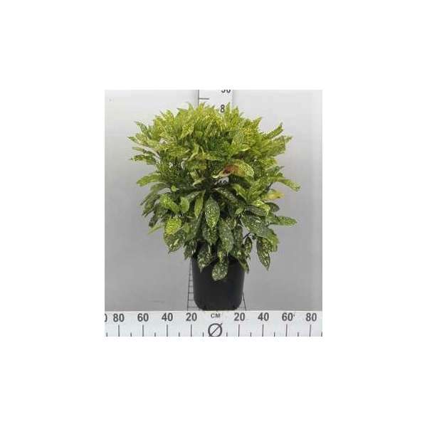 Aucuba japonica 'Crotonifolia' heeft geelbont leerachtige bladeren.