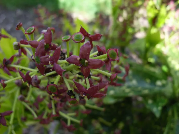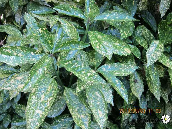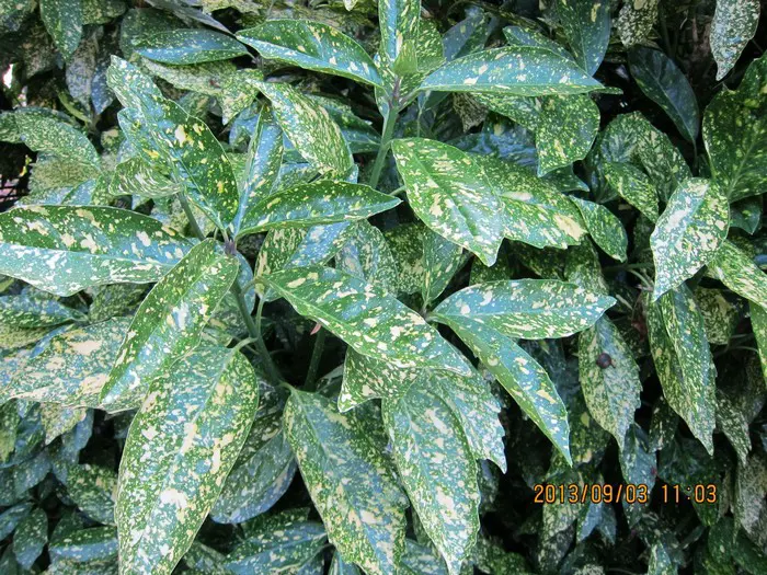 Aucuba japonica 'Crotonifolia' is een vrouwelijke plant en heeft een mannelijke plant in haar nabijheid nodig om rode bessen te produceren.