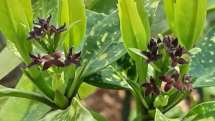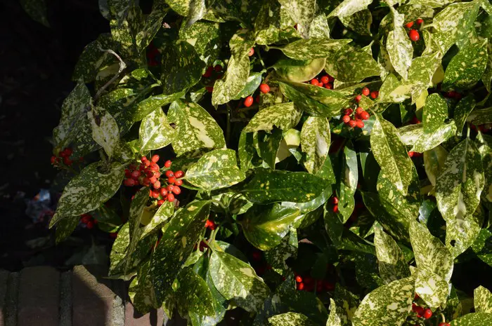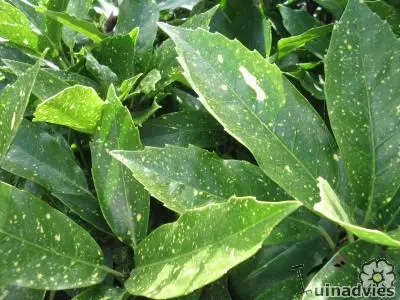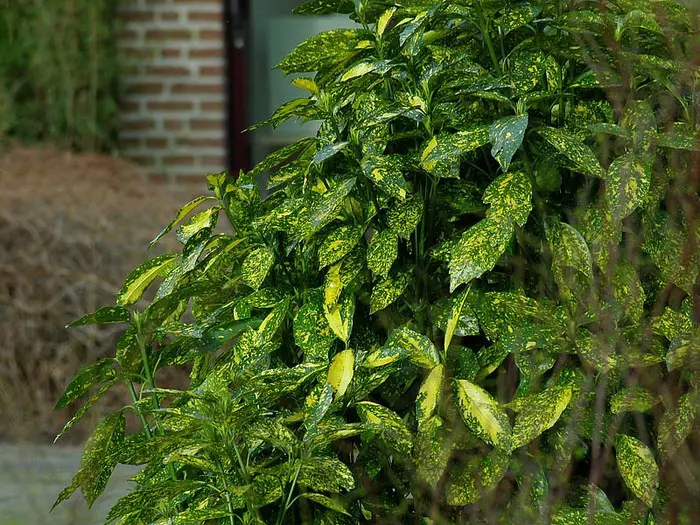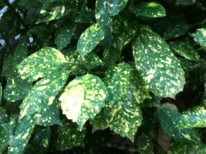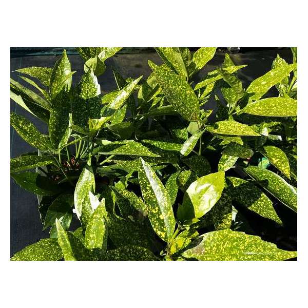 Deze aucubasoort is de meest voorkomende in de tuinen, ze groeien overal ook onder bomen en alle soorten grond. Het blad is leerachtig en gespikkeld, meer gespikkeld in de schaduw dan in de zon.