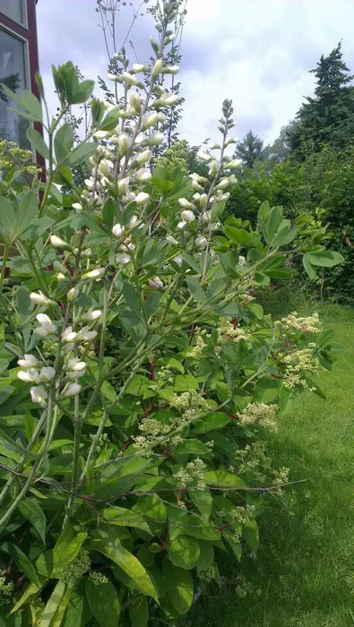 Bloeit met rechtopstaande trossen van witte bloemen gevolgd door opgeblazen zaaddozen die bruin of zwart worden als ze rijp zijn.